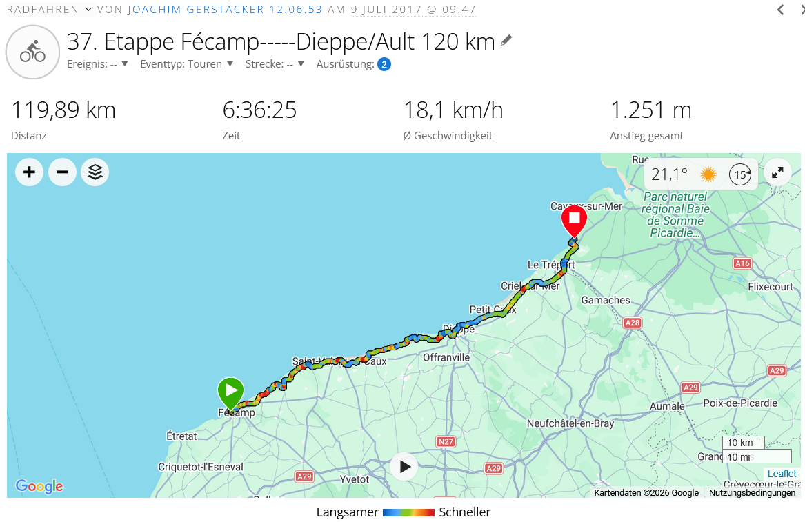 Nach dem Ruhetag und der etwas kürzeren Etappe von heute, bin ich 7.00 Uhr aufgestanden, es war ziemlich nebelig am Meer und das Zelt entsprechend nass, das Überzelt auch von innen, was aber normal ist. Um es dann einigermaßen trocken zu verstauen, brauche ich die Hilfe der Sonne. Gestern früh habe ich festgestellt, dass an meinem Platz vor 8.30 Uhr kein Sonnenstrahl hinkommt, ich habe dann alles andere eingepackt und das Zelt dann später zum Trocknen in die Sonne gebracht, kurz vor 10.00 Uhr bin ich dann in Fecamp weggefahren.