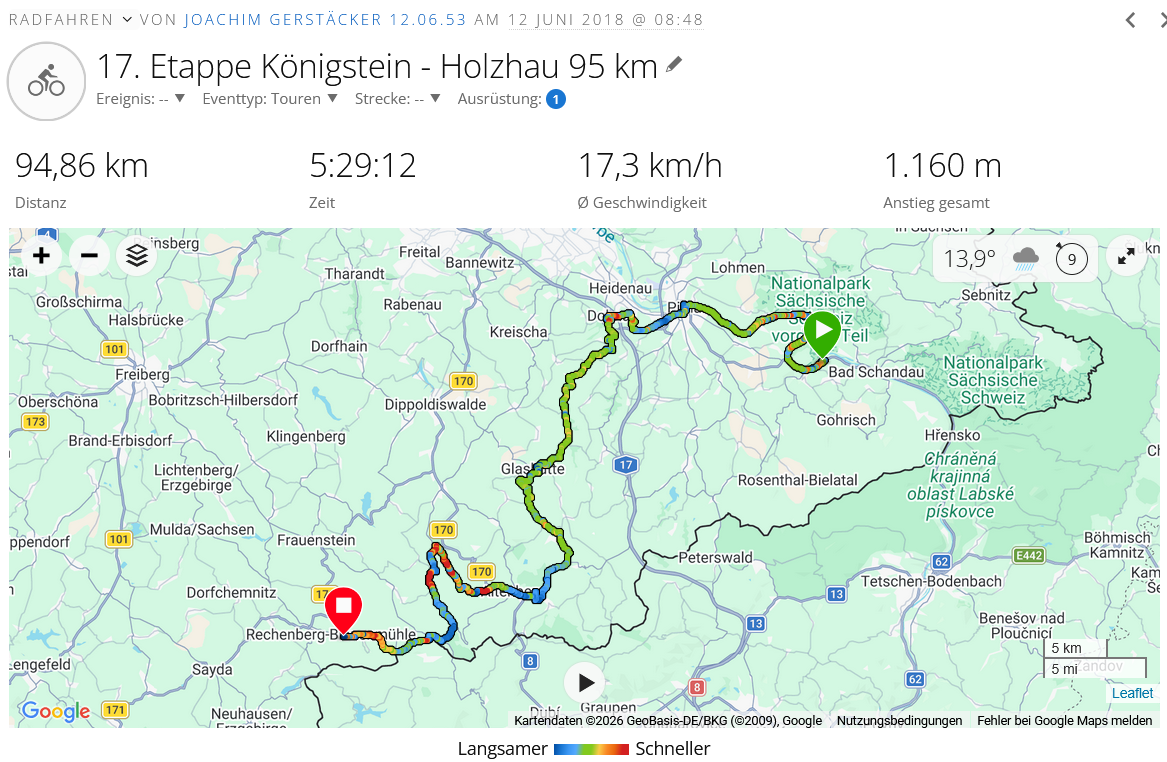 12. Juni, mein Geburtstag auf der 17. Etappe….es war eine Genuss-Fahrt in die Heimat, bis auf die letzten 9 km…..