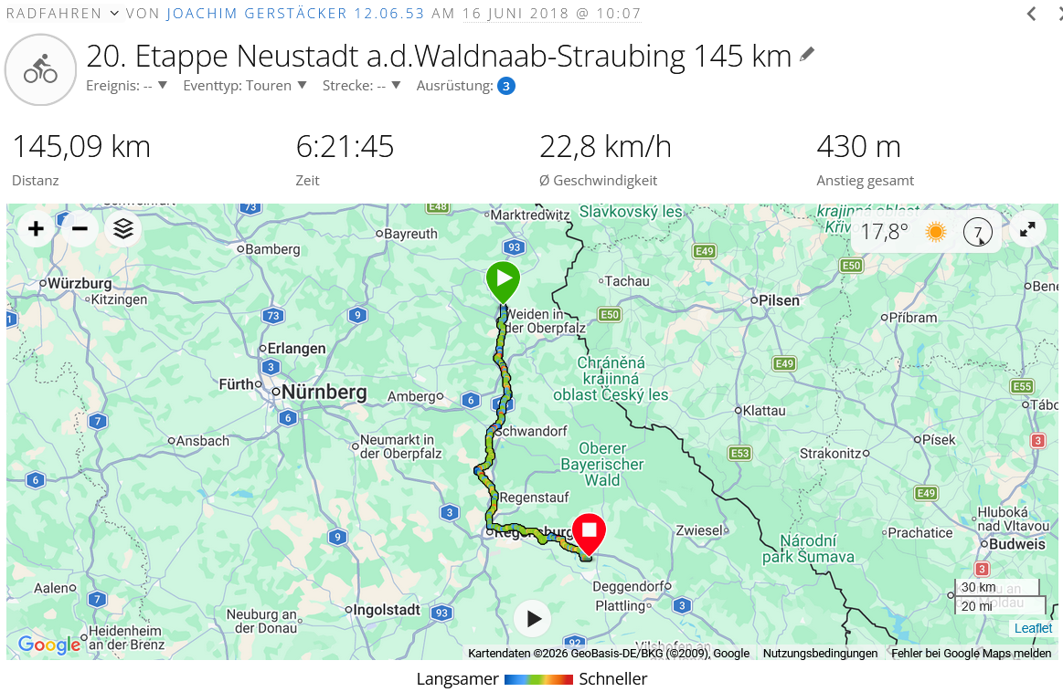 Nach den schweren Etappen der letzten beiden Tage war es heute eine flache und schnelle Strecke…im Tal der Naab an die Donau…Landschaftlich sehr schön