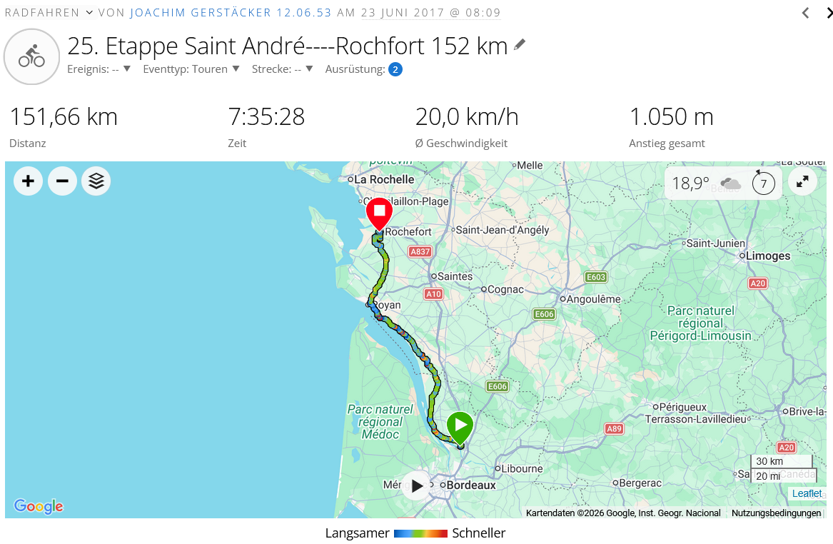 Es war wieder eine Etappe mit über 150 km, dazu ein starker Westwind, entweder von vorn oder von der Seite. Die kleinen Straßen rechts von der Gironde eine Katastrophe, der Belag so etwas von rauh und holprig und das zieht die Kraft nur so aus den Beinen und ich merke auch, dass ich 4 Wochen unterwegs bin…. 3100 km gefahren, das ist so die Gesamtstrecke bei der großen TdF, naja, die fahren dafür nur 3 Wochen, ich aber mit 47 kg Gewicht, die Profis mit 7kg.