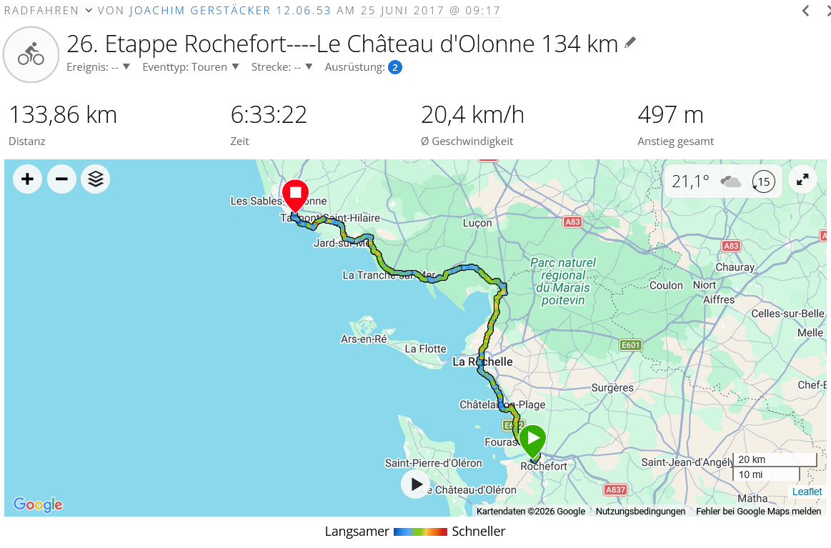 Heute wieder eine Etappe nach einem Ruhetag und es ging ziemlich gut, der Wind spielte bis La Rochelle keine Rolle, erst später und je nach Fahrtrichtung war es Seitenwind oder direkt von vorn.