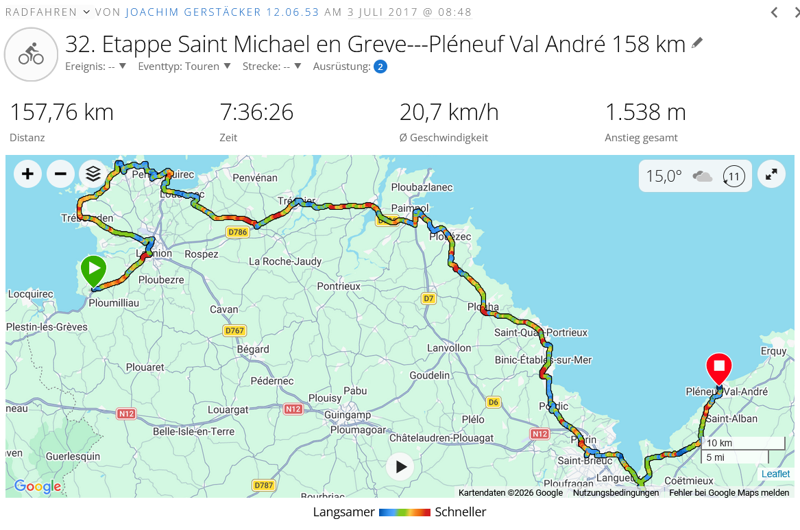 Für mich ging es dann mit einer längeren Abfahrt Richtung Saint Brieuc, auf der anderen Seite aber auch gleich wieder steil nach oben , ich bin den Berg zweimal gefahren, weil ich beim ersten Mal dachte ich sei falsch, bin wieder runter, habe gesucht und feststellen müssen, es kann nur über den Berg gehen…