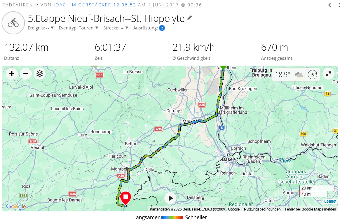 Heute noch eine relativ flache Etappe, die Fahrt geht bis Neuenburg entlang des Rheins, dann in westliche Richtung über Mulhouse in Richtung Montbeliard und bei Audincourt erreiche ich das Tal des Doubs. An diesem französisch-schweizerischen Grenzfluß fahre ich dann bis Sain-Hyppolyte. Auf diesen 128 km fahre ich vom Start bis zum Ziel ungefähr 200 Höhenmeter, das sollte kein Problem werden. Morgen wird es dann schon anspruchsvoller.